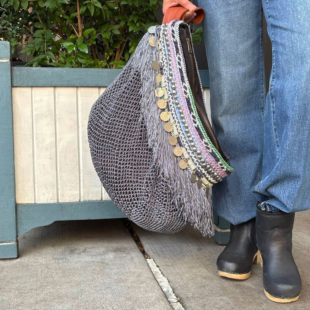 Featuring hand knotted net body, a unique one-of-a-kind belt detail composed of vintage coins, beads and studs.